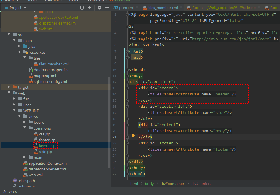 필자는 header를 사용하지않을 것이기 때문에 layout.jsp 해당 <tiles:inserAttribute>를 삭제해야한다.