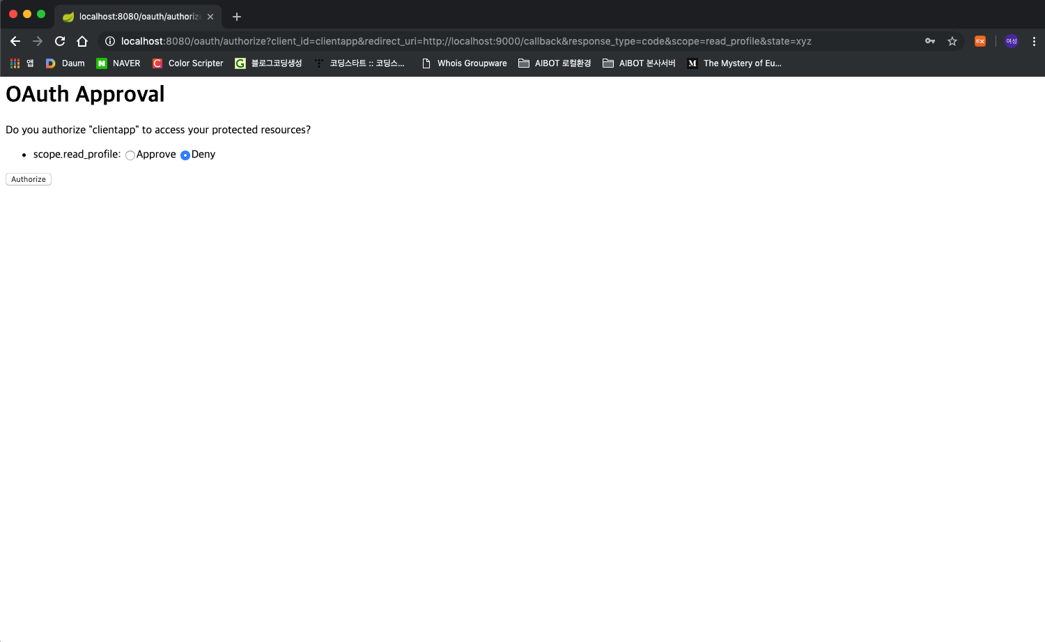 만약 로그인에 성공하였다면 Resource Owner에게 Client가 자신의 리소스를 사용하기 위해 Resource Server에 접근하는 것을 허락할 것인가를 물어보는 페이지를 보여준다. Approve를 클릭하고 인증버튼을 누르자.