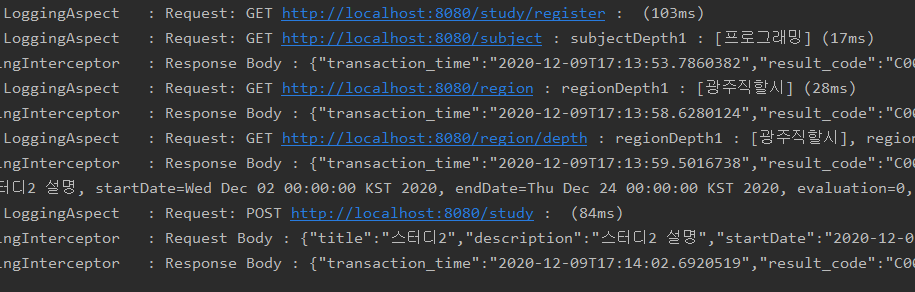 즉, response와 request는 servlet단위로 실행되기 때문에 그저 들어온 값과 나가는 값을 로그만 찍어주면 될 경우 aop보다는 interceptor에서 로그를 찍는게 더 올바른 구조로 보인다.