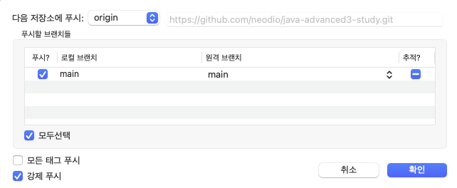 "강제 푸시" 체크박스를 선택하고 확인 버튼 클릭
