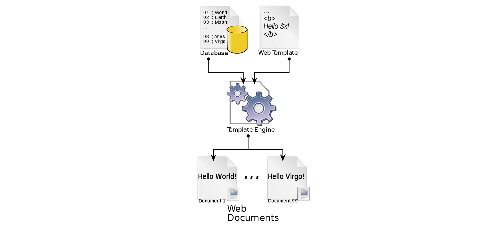 - 즉, 웹 템플릿 엔진은 웹 템플릿들(web templates)과 웹 컨텐츠 정보(content information)를 처리하기 위해 설계된 소프트웨어이다.